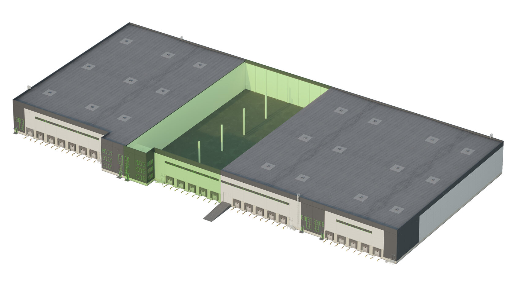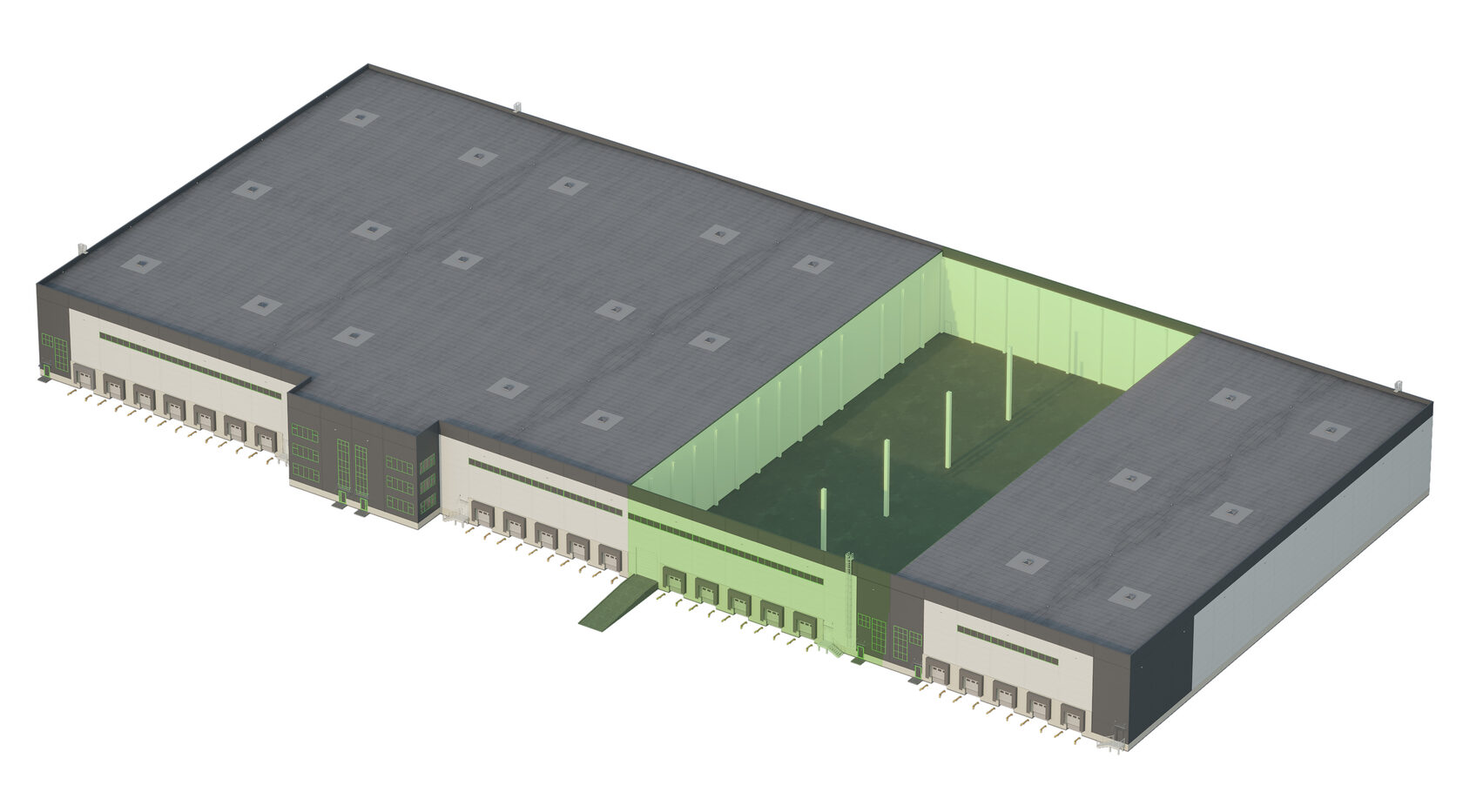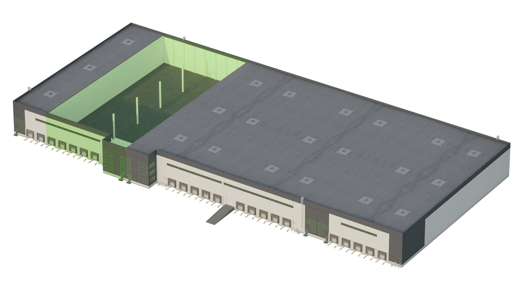 Прочные железобетонные колонны обеспечивают свободную планировку. Ворота встроены в готовые утеплённые панели без необходимости отделки.